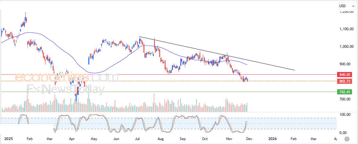 Therefore we expect the stock to decline in its upcoming trading, as long as it remains below the resistance level of $840.00, targeting the support level of $742.40.