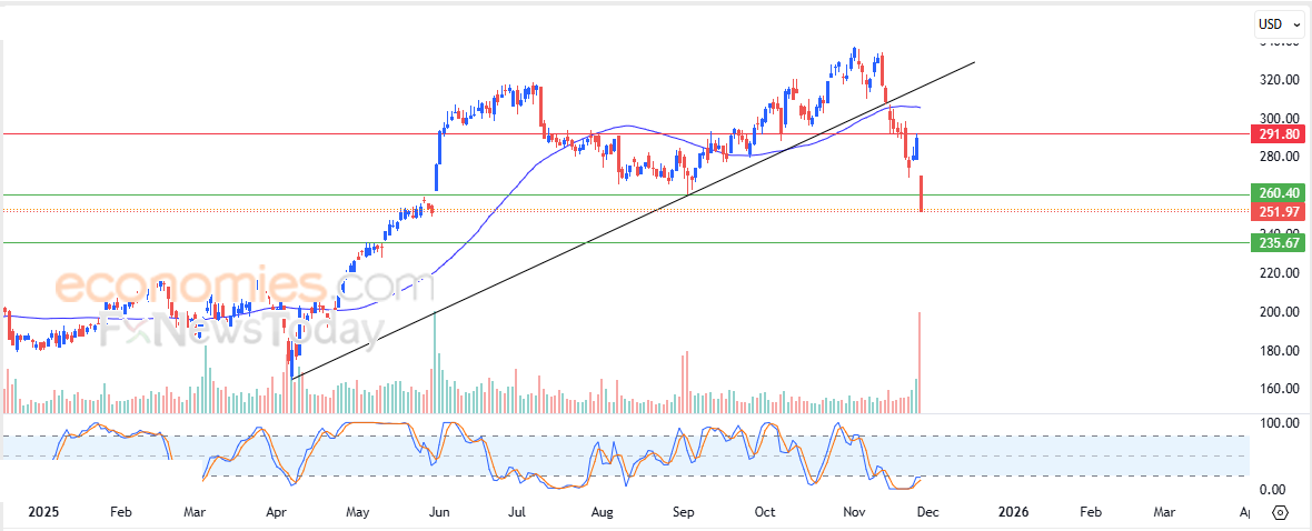Therefore we expect the stock to decline in its upcoming trading, especially as long as it remains below $260.40, targeting the first support level at $235.65.
