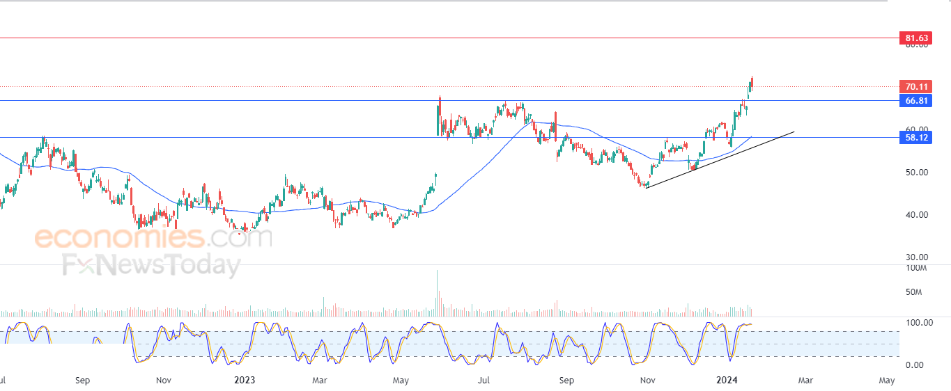 Therefore we expect the stock to return higher, targeting the resistance of 81.60, provided it settles above 66.80.