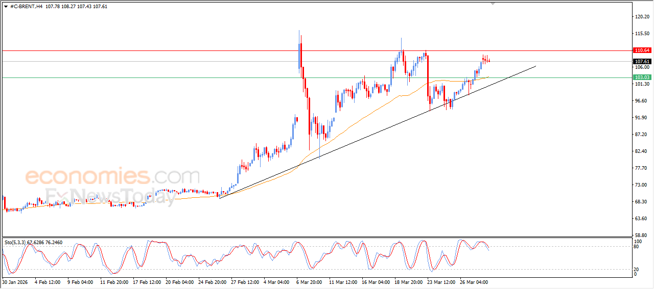 Brent crude oil declined slightly in recent intraday trading, amid emerging negative signals from the relative strength indicators after reaching heavily overbought levels. The price is attempting to gather positive momentum that could help it resume its strong gains, while also undergoing profit-taking.