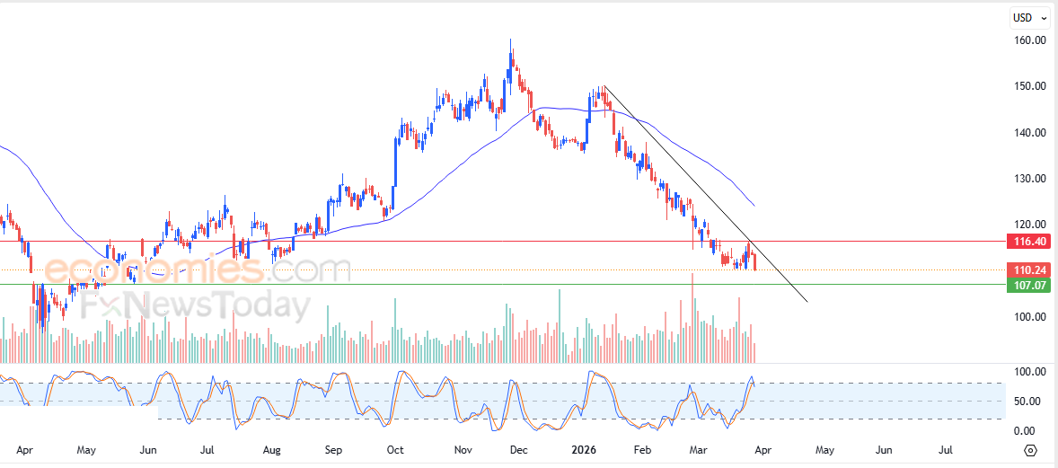 Therefore, we expect the stock price to decline in upcoming trading sessions as long as the resistance level at $116.40 holds, targeting the first support level at $107.00.