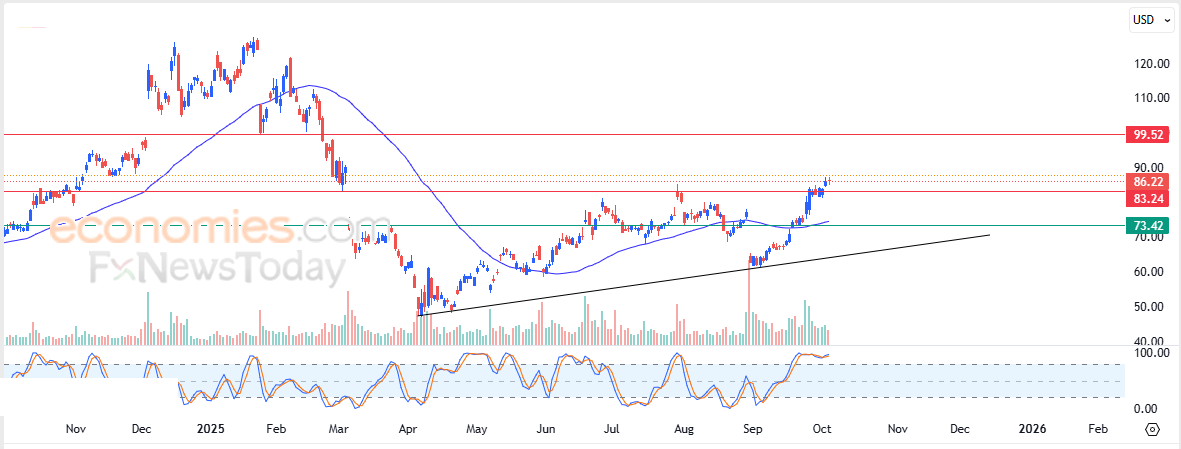 Marvell Technology (MRVL) settled higher in its latest intraday trading, confirming a breakout above the key resistance level of 83.25, which had been our previous upside target. The move comes amid the dominance of a short-term corrective uptrend and the stock’s movement along a supporting trendline, reinforced by continued positive pressure from trading above its 50-day simple moving average. Moreover, RSI indicators are showing fresh bullish signals despite remaining in overbought territory.