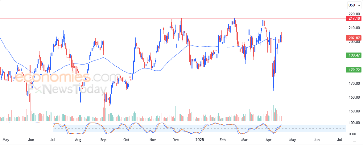 Therefore we expect the price to return higher, targeting the pivotal resistance of $217.00, provided the support of $190.50 holds on.
