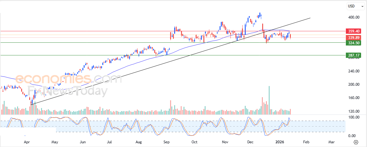 Therefore we expect the stock price to decline in upcoming trading, as long as the $359.40 resistance level remains intact, especially if it breaks below the key support at $324.50, to target the next support at $287.00.
