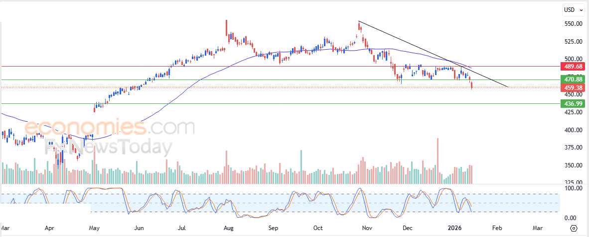 Microsoft Corp. (MSFT) stock price recorded a decline in its latest intraday trading, with the stock breaking below the key support level at $470.90. This move comes amid the dominance of a short-term corrective downward wave, with price action moving along a supportive trend line for this move, alongside incoming negative signals from the RSI. In addition, continued negative pressure persists from trading below its SMA50, which further intensifies the surrounding bearish pressure on the stock.
