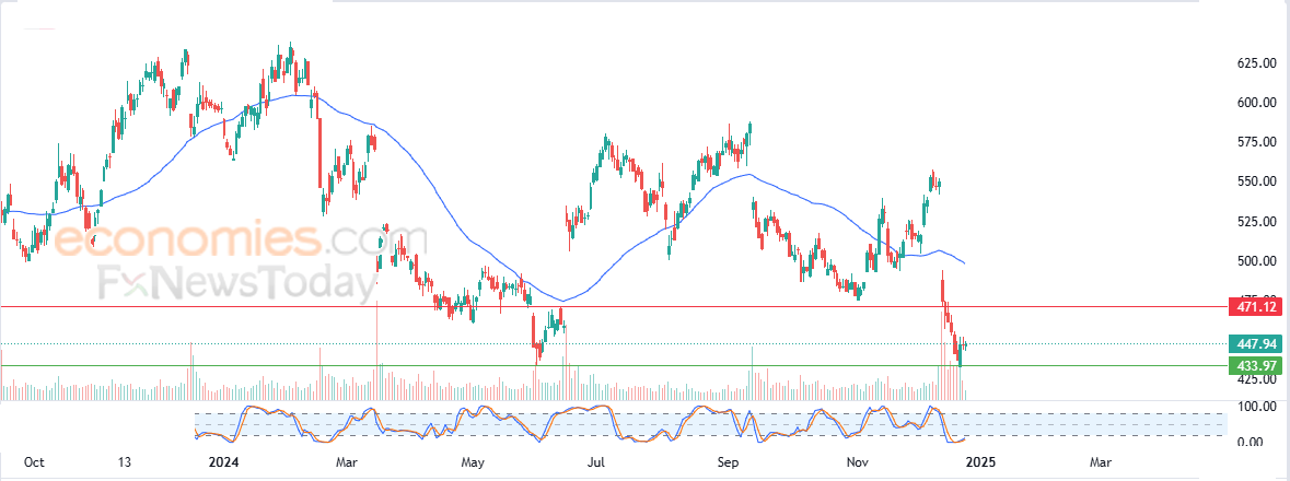 Therefore we expect the stock to return lower, targeting the pivotal support of $433.97, provided the resistance of $471.12 holds on.