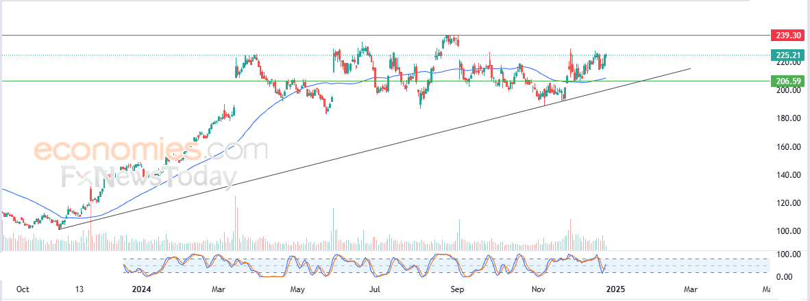 Therefore we expect more gains for the stock, targeting the pivotal resistance of $239.30, provided the support of $206.60 holds on.