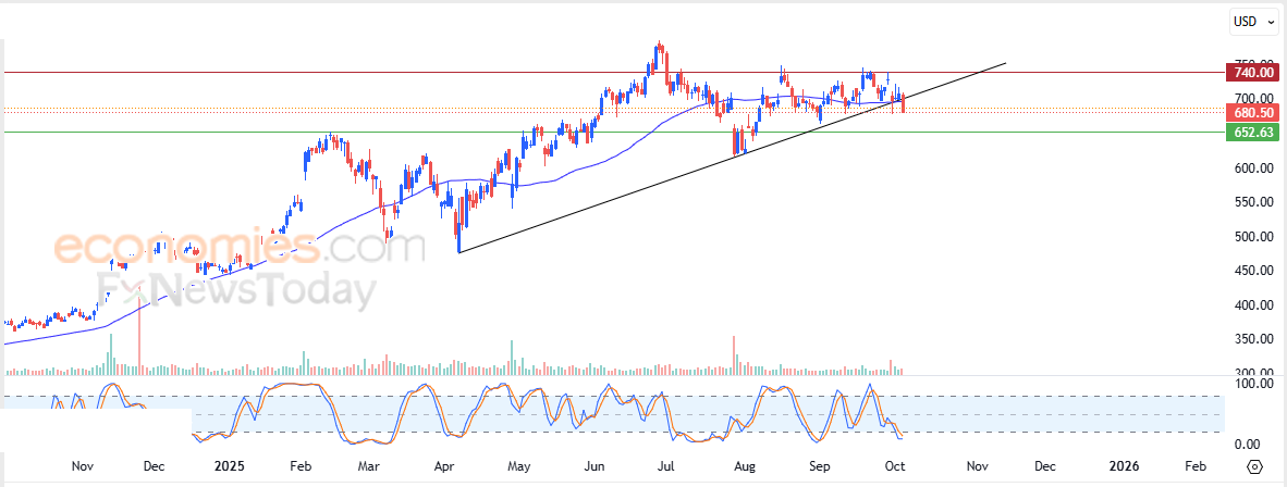 Therefore, we expect the stock to fall in upcoming trading sessions, as long as it remains below 740.00, targeting the first support level at 652.65.