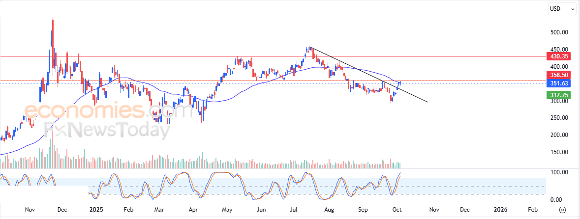 Therefore, our outlook leans toward a potential rise in the stock’s price in upcoming trading sessions, but only after breaking above the mentioned resistance at 358.50, targeting the next resistance level at 394.00.