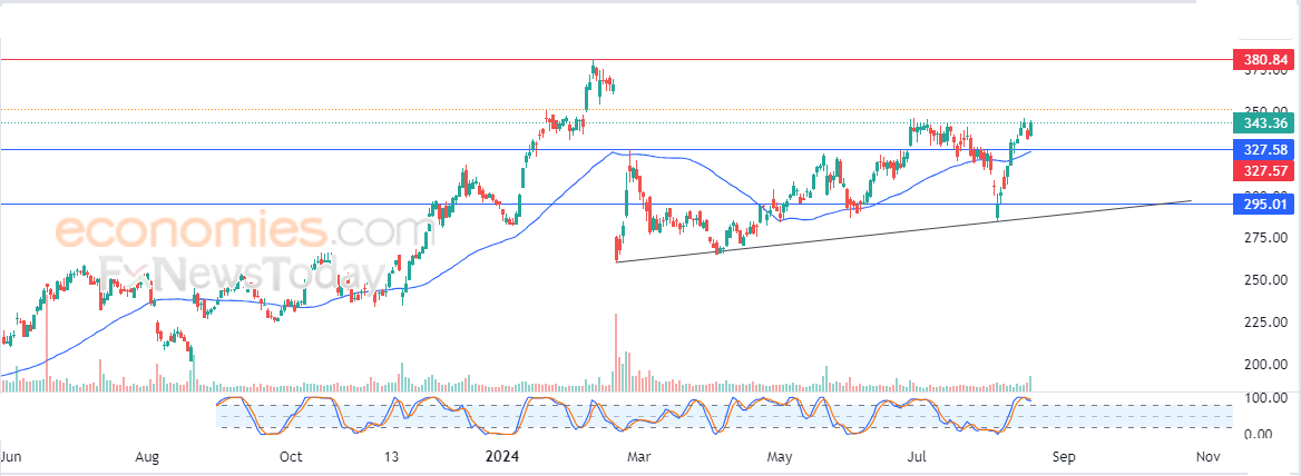 Therefore we expect more gains for the stock, targeting the pivotal resistance of $380.85, provided it settles firmly above $327.60.