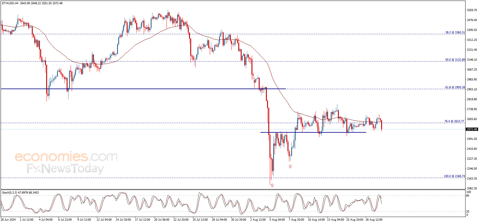 Ethereum price (ETHUSD) faces new negative pressure to test the key support 2545.00$, which urges caution from the upcoming trading, as continuing the decline and breaking this level will stop the recently suggested positive scenario and force the price to turn to decline, to start building bearish wave that targets 2345.00$ areas initially.