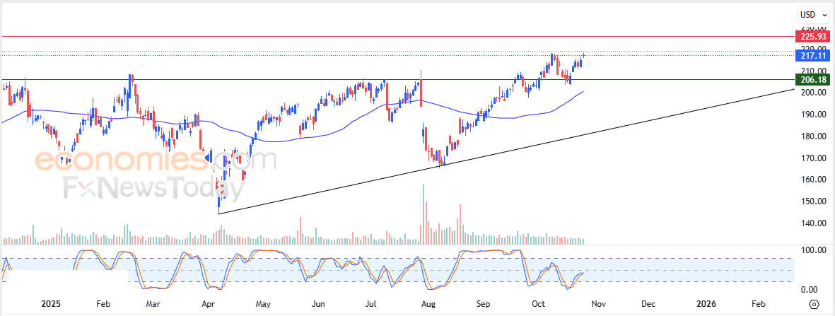 Therefore, we expect the stock to rise in its upcoming trading sessions as long as the support level of $206.00 holds, targeting the first resistance level at $226.00.
