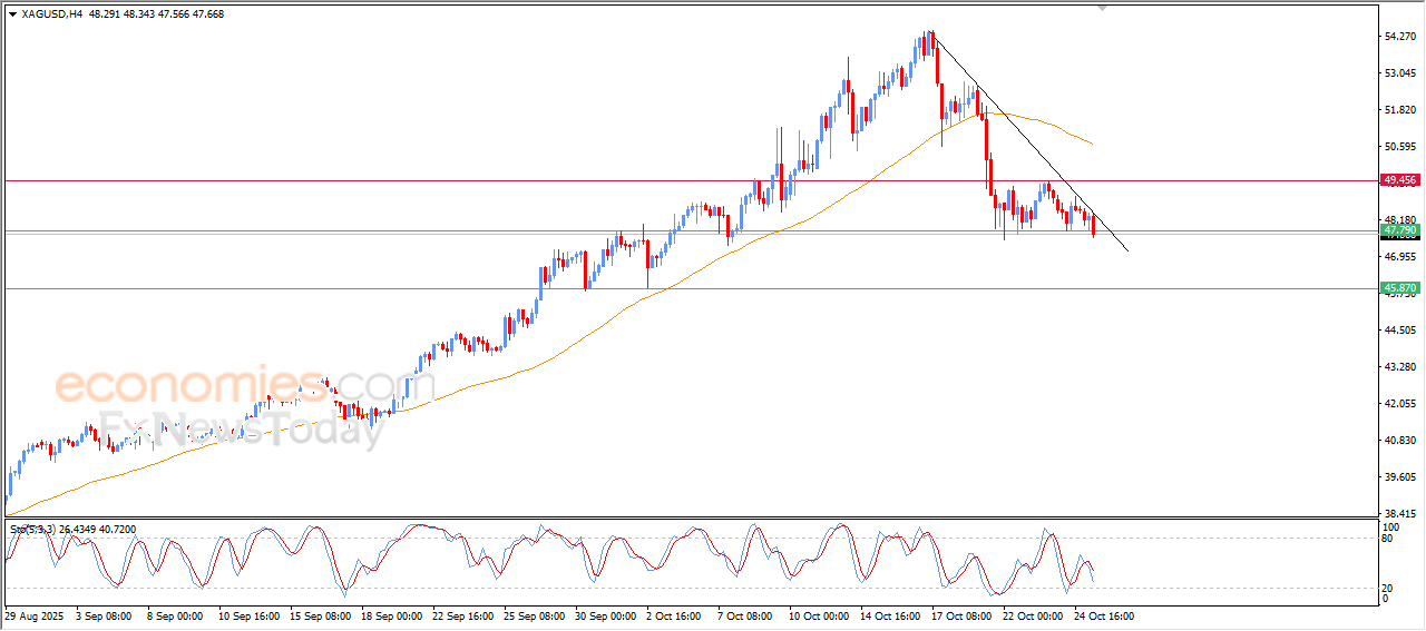 The price of (silver) declined during its last trading on the intraday basis, with the emergence of the negative signals on the relative strength indicators, after offloading its oversold conditions, opening the way for deepening its intraday losses, amid the continuation of the negative pressure that comes from its trading below EMA50, reinforcing the stability of the bearish corrective trend on the short-term basis.