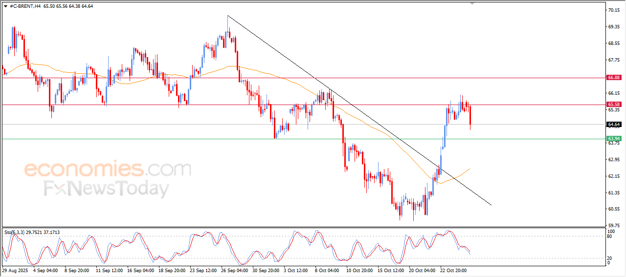 Brent crude oil prices declined in their last intraday trading, amid the emergence of the negative signals on the relative strength indicators with the stability of the key resistance at $65.60, the price begins to look for a rising low to take it as a base that might help it to gain the required bullish momentum for its recovery, amid its affection by breaching main bearish trend line on the short-term basis, with the continuation of the dynamic support that is represented by its trading above EMA50, reinforced by the stability of the positive corrective track.