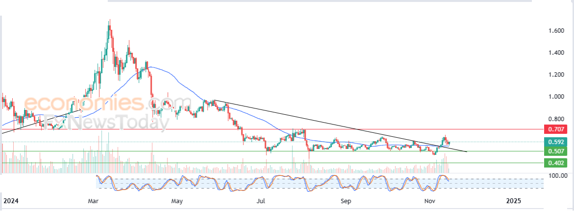 Therefore we expect the price to rise and target the important resistance of $0.707, provided the support of $0.507 holds on.