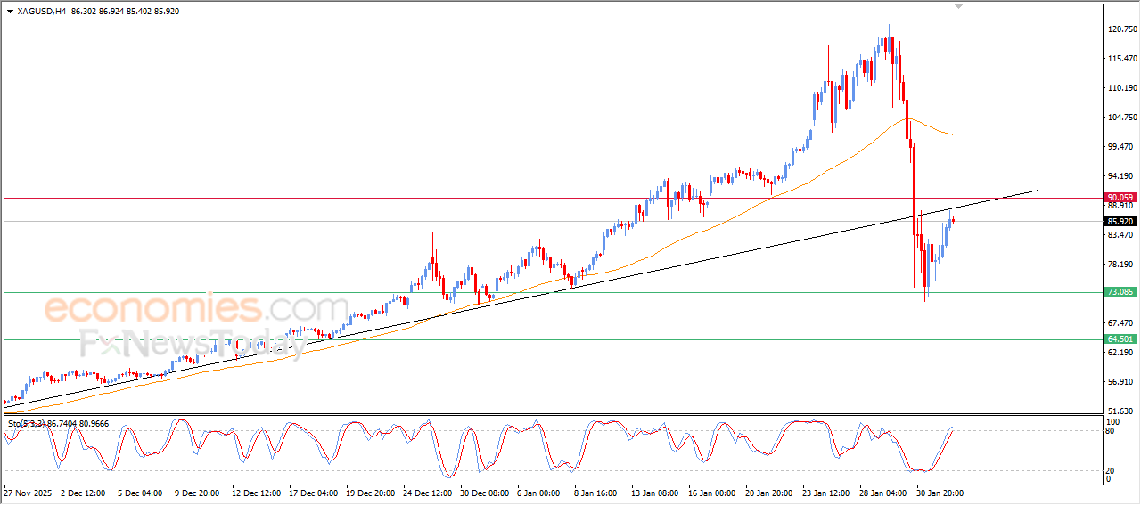 The price of (silver) keeps its early gains on its last intraday levels, retesting previously broken main bullish trend line on short-term basis, amid the continuation of the dynamic pressure that is represented by its trading below EMA50, reducing the chances of sustainable recovery on near-term basis, especially with the relative strength indicators reaching overbought level, exaggeratedly compared to the price move, indicating a quick fading to the bullish momentum.