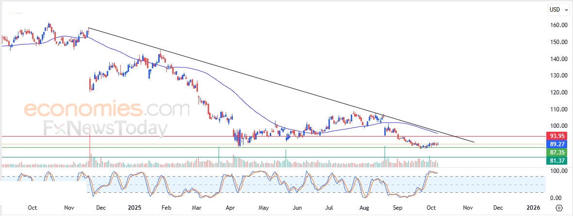 Target Corporation (TGT) moved within a narrow sideways range in its latest intraday trading, preparing to break below the key support level of 87.35. The stock remains under sustained negative pressure, trading below its 50-day simple moving average, and within the dominance of a medium-term bearish trend along a descending line. Additionally, a negative divergence has begun forming on the RSI after it reached heavily overbought areas, signaling a potential loss of bullish momentum as bearish signals start to emerge.