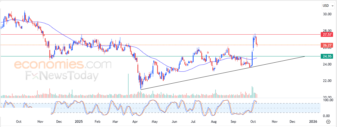 Therefore, we expect the stock to rise in upcoming trading sessions, as long as support holds at 24.95, aiming to retest the mentioned resistance level of 27.57 in preparation for a possible breakout.