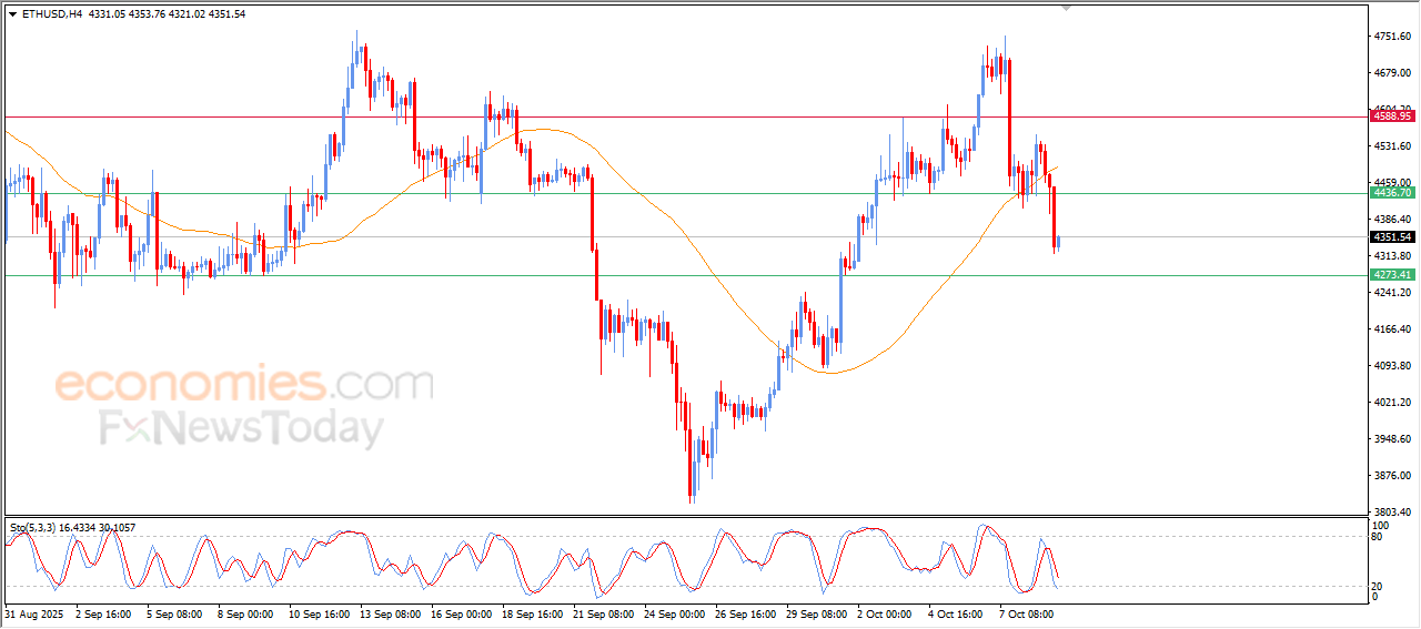 The price of (ETHUSD) slipped lower in its last intraday trading, breaking $4,435 support, and there is a negative pressure due to its trading below EMA50, and under the dominance of bearish corrective wave on the short-term basis, besides the emergence of the negative signals on the relative strength indicators, after reaching overbought levels, intensifying the negative pressure on the last trading.