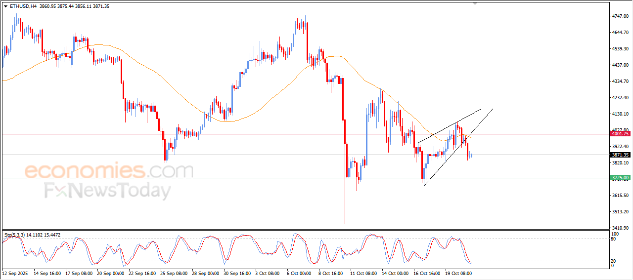 The price of (ETHUSD) settled with strong declines in its last intraday levels, affected by forming bearish technical formation on the short-term basis, which is the rising wedge pattern, and there is continuous negative pressure due to its trading below EMA50, reducing the chances of the price recovery on the near-term basis, with the emergence of the negative signals on the relative strength indicators, despite reaching oversold levels.
