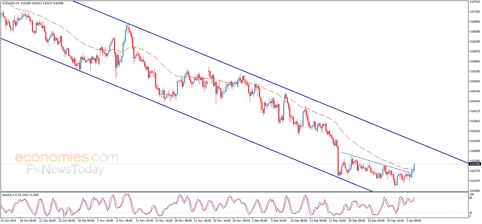 The AUDUSD price shows additional positive trades to attack 0.6245$ and attempt to hold above it, to head towards achieving more expected gains for the rest of the day and target the bearish channel’s resistance line around 0.6320$.