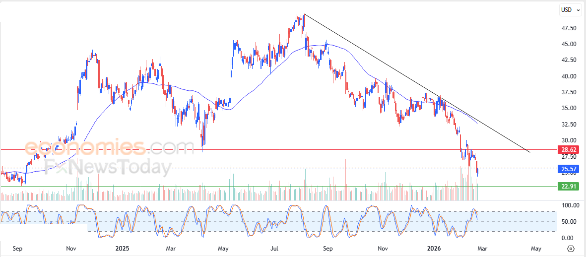 Therefore we expect the stock price to decline during its upcoming trading sessions, as long as resistance at $28.65 remains intact, targeting the key support level at $22.90.