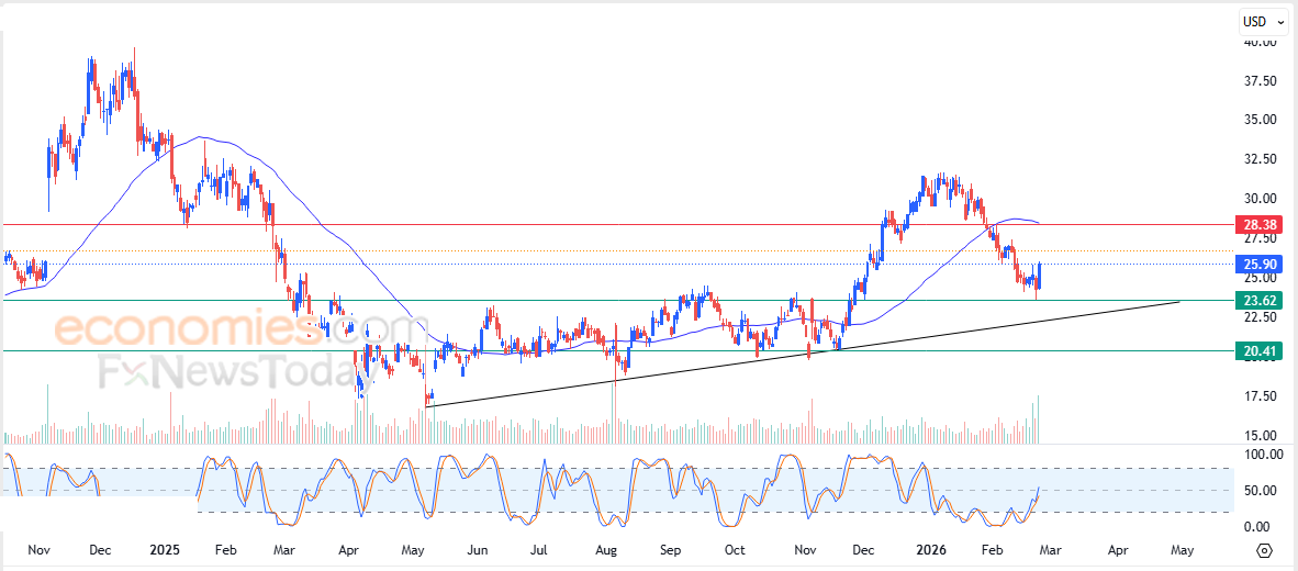 Therefore we expect the stock price to rise during its upcoming trading sessions, provided that support at $23.60 remains intact, targeting the resistance level at $28.35.