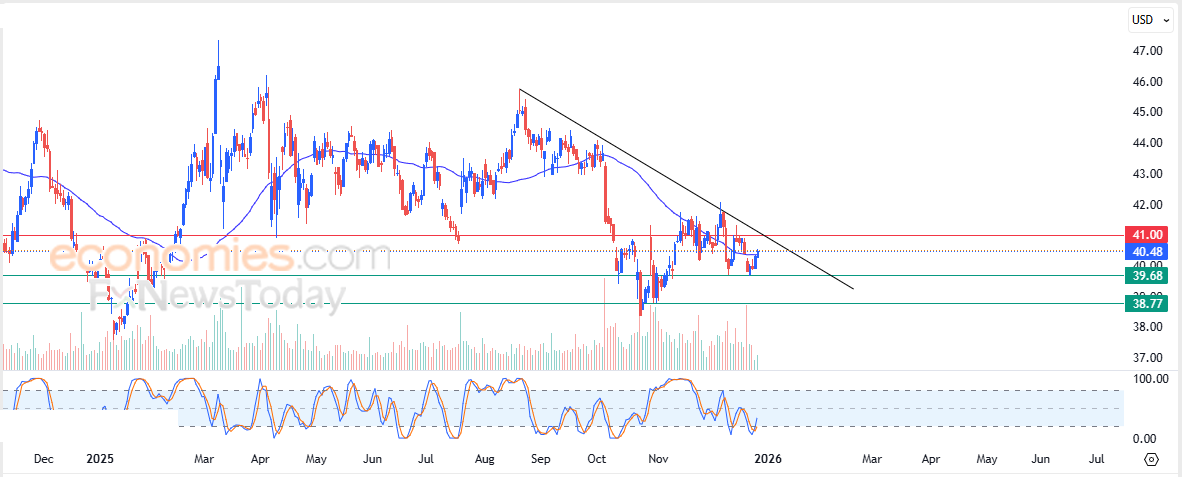 Therefore we expect the stock price to decline in the upcoming intraday trading, as long as resistance at 41.00 holds, to target the support level at 39.70.