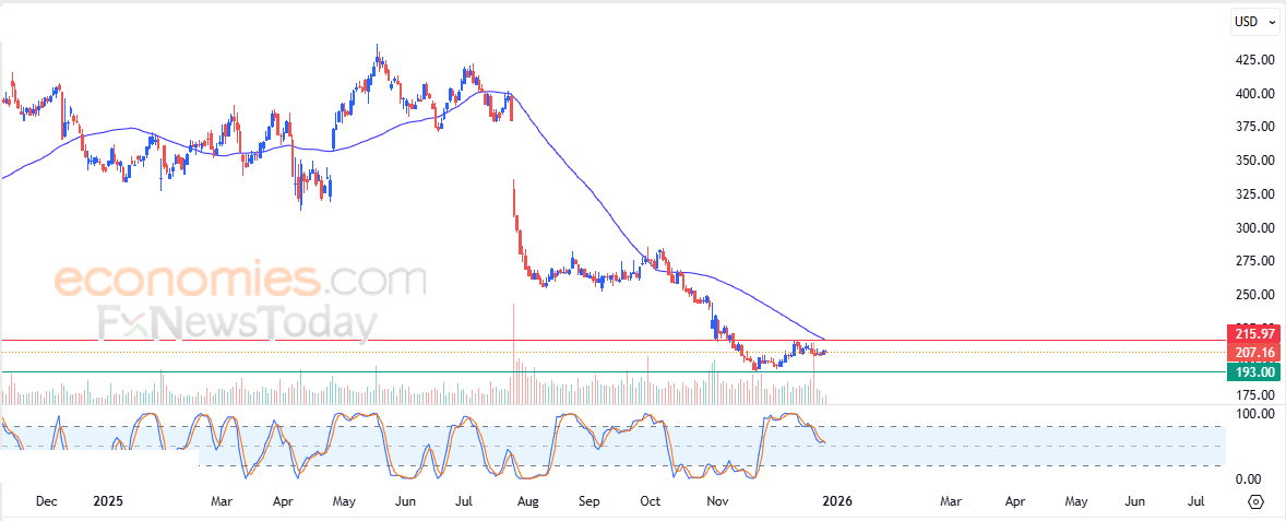 Therefore we expect the stock price to decline further in the upcoming intraday trading, as long as resistance at 216.00 holds, to target the support level at 193.00.