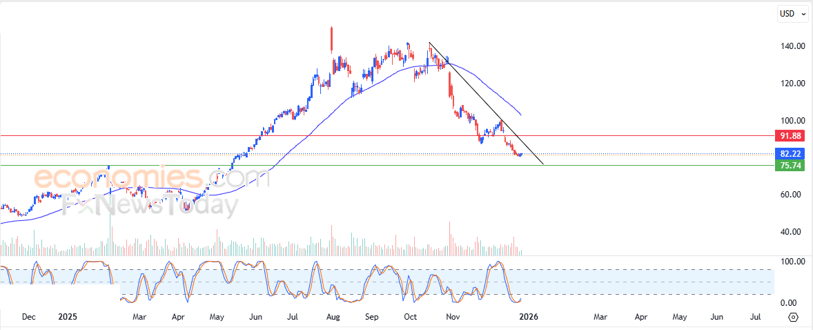 Therefore we expect the stock price to decline in the upcoming intraday trading, as long as resistance at 91.90 holds, to target the support level at 75.75.