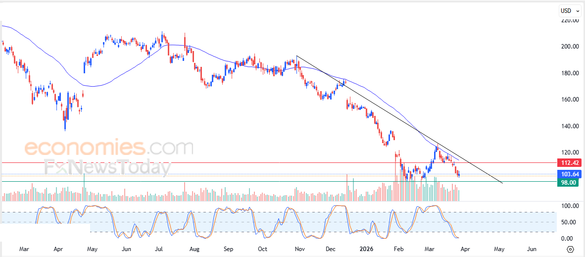 Therefore we expect the stock price to decline in the coming trading sessions, as long as it remains below the resistance level at $112.50, targeting the key support level at $98.00.