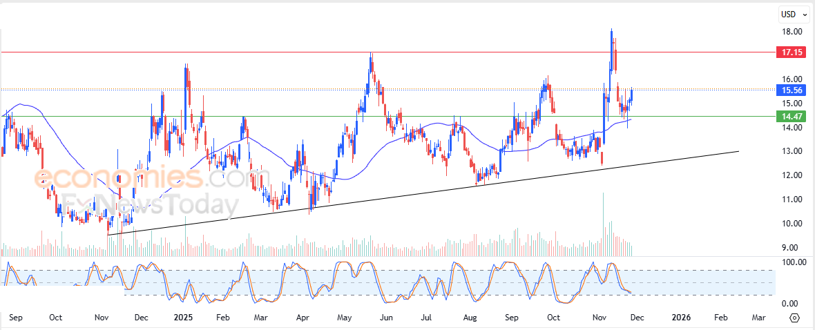 Therefore, we expect the stock’s price to rise in the upcoming sessions, as long as support holds at $14.50, targeting the key resistance at $17.15.