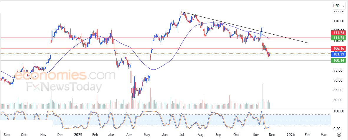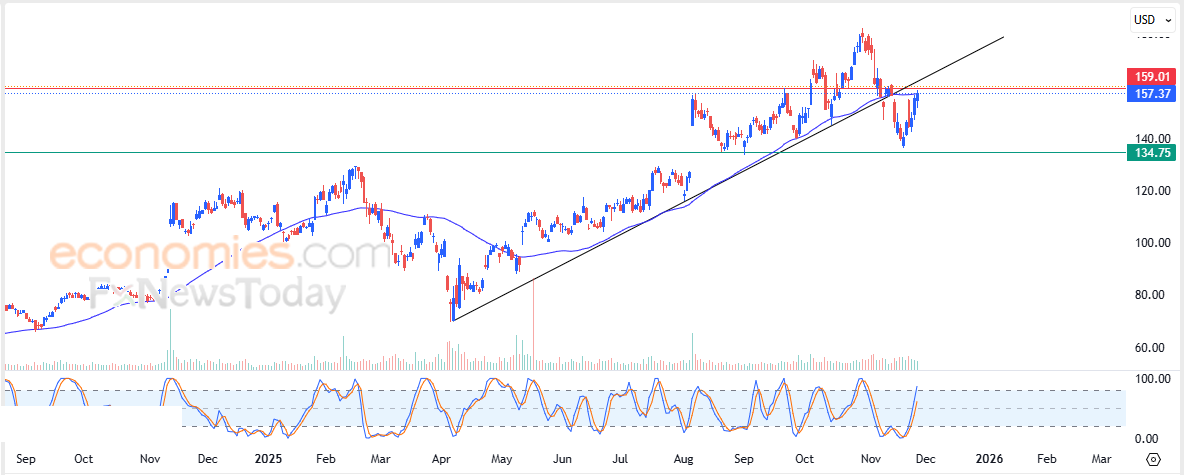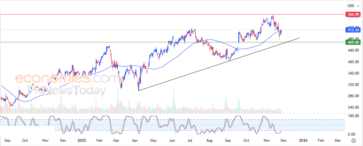 CrowdStrike’s price (CRWD) rose slightly in its latest intraday trading, as the stock attempts to break free from the negative pressure of the 50-day simple moving average. This improvement is supported by the emergence of positive signals from the relative strength indicators after reaching extremely oversold levels. The move comes within the context of a dominant short-term uptrend, with the stock trading along a supportive ascending trendline.