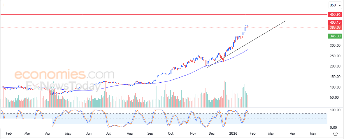 Micron Technology, Inc. (MU) stock price recorded a slight pullback in its latest intraday trading, following the stabilization of the psychological resistance level at $400.00, as the stock took profits from its previous gains while attempting to build positive momentum that could help it break above this resistance. At the same time, the stock is trying to unwind part of its clear overbought conditions on the RSI, especially with the beginning of incoming negative signals, amid continued dynamic support from trading above its SMA50 and under the dominance of the main short-term upward trend.