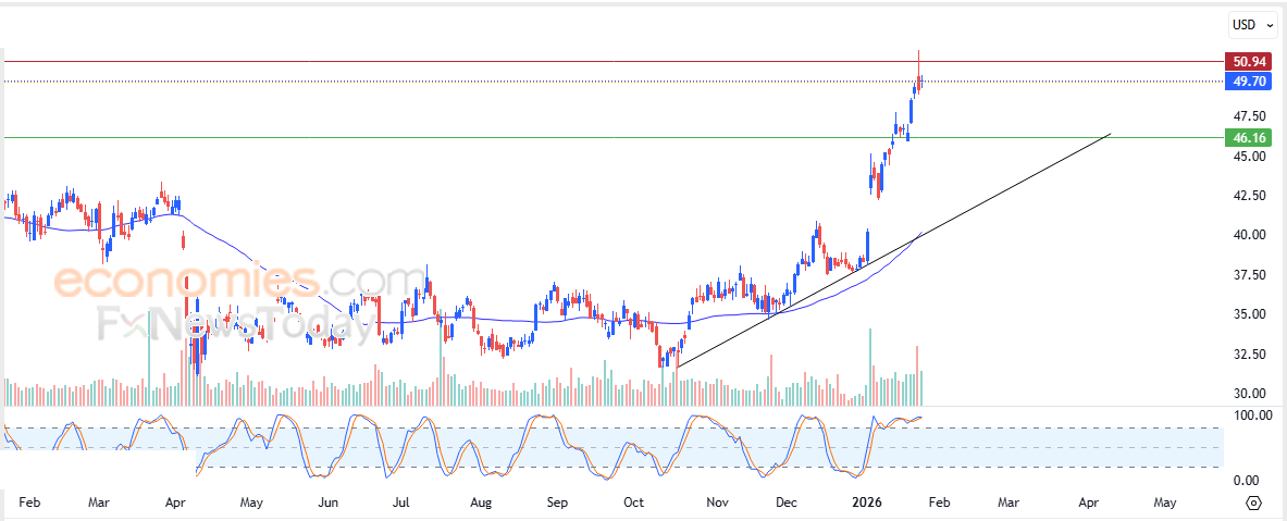 Therefore we expect the stock price to rise in upcoming trading, to retest the nearby and key resistance level at $50.95, with strong chances for a breakout.