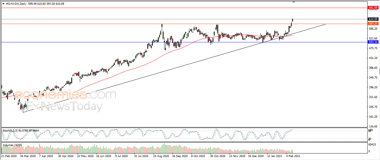 Nvidia's stock kept rising in the intraday levels, piercing the pivotal resistance of 587.35 and marking a 3.30% profit in the last session, amid the dominance of the main upward trend in the medium term, with positive pressure from the 50-day SMA.