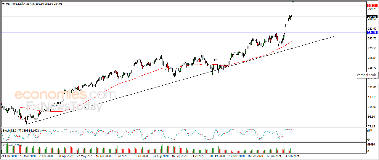 PayPal Holdings' stock (PYPL) rose to a session high at 301.89 before bouncing back and trimming gains to 0.65%, as traders collect profits, while the stock vents off overbought saturation in the RSI, amid positive support from the 50-day SMA.