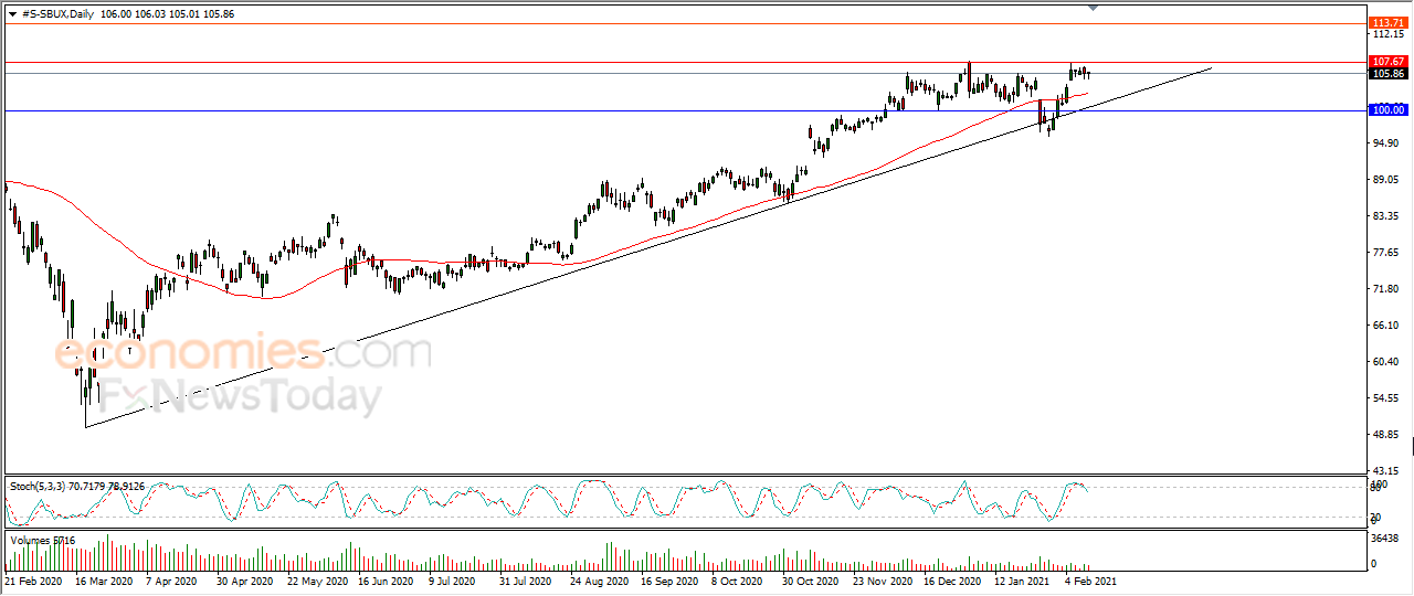 Starbucks' stock (SBUX) barely inched down in the last session while gathering momentum to help it pierce the pivotal resistance of 107.65, while venting off overbought saturation in the RSI amid negative signals out of them, while trading alongside the main upward medium-term trend line, with positive support from the 50-day SMA.