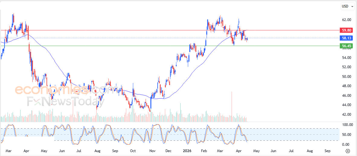 Therefore, we expect the stock price to decline during its upcoming trading sessions, as long as resistance at 59.80 remains intact, targeting the key support level at 56.45.