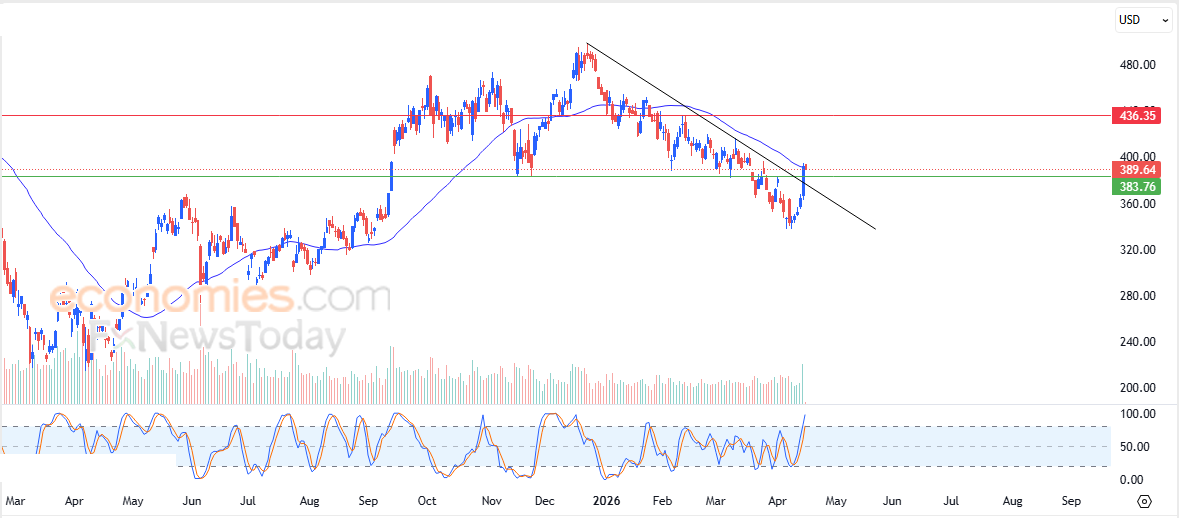 Therefore, we expect the stock price to rise during its upcoming trading sessions, especially as long as it remains stable above 383.75, targeting the resistance level at 436.35.