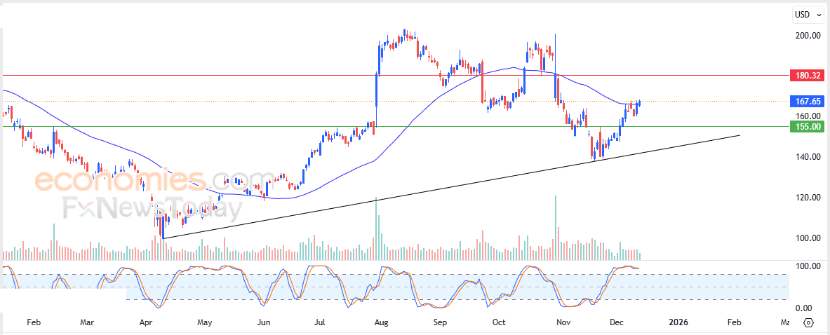 Generac Holdings Inc. (GNRC) rose in its latest intraday trading, benefiting from the dominance of the main medium-term ascending trend with the price moving alongside a supporting trendline. The stock is attempting to shed the negative pressure of its previous 50-day SMA. However, this effort is being constrained by the arrival of negative signals from the RSI indicators after they reached extremely overbought levels, which may temporarily halt a full recovery.