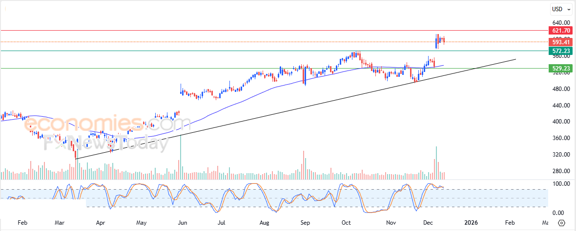 Therefore we expect the stock to rise in its upcoming trading, especially as long as it remains above the support level of $572.20, targeting the first resistance level at $621.70.