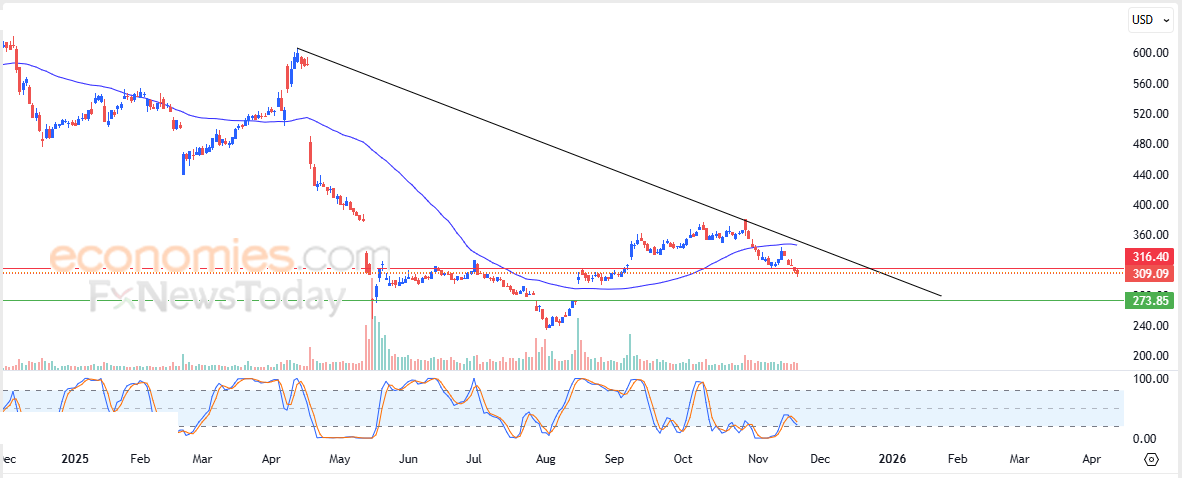 Therefore, we expect the stock’s price to decline in the upcoming sessions, especially if it stabilizes below 316.40 dollars, targeting its first support level at 273.85 dollars.