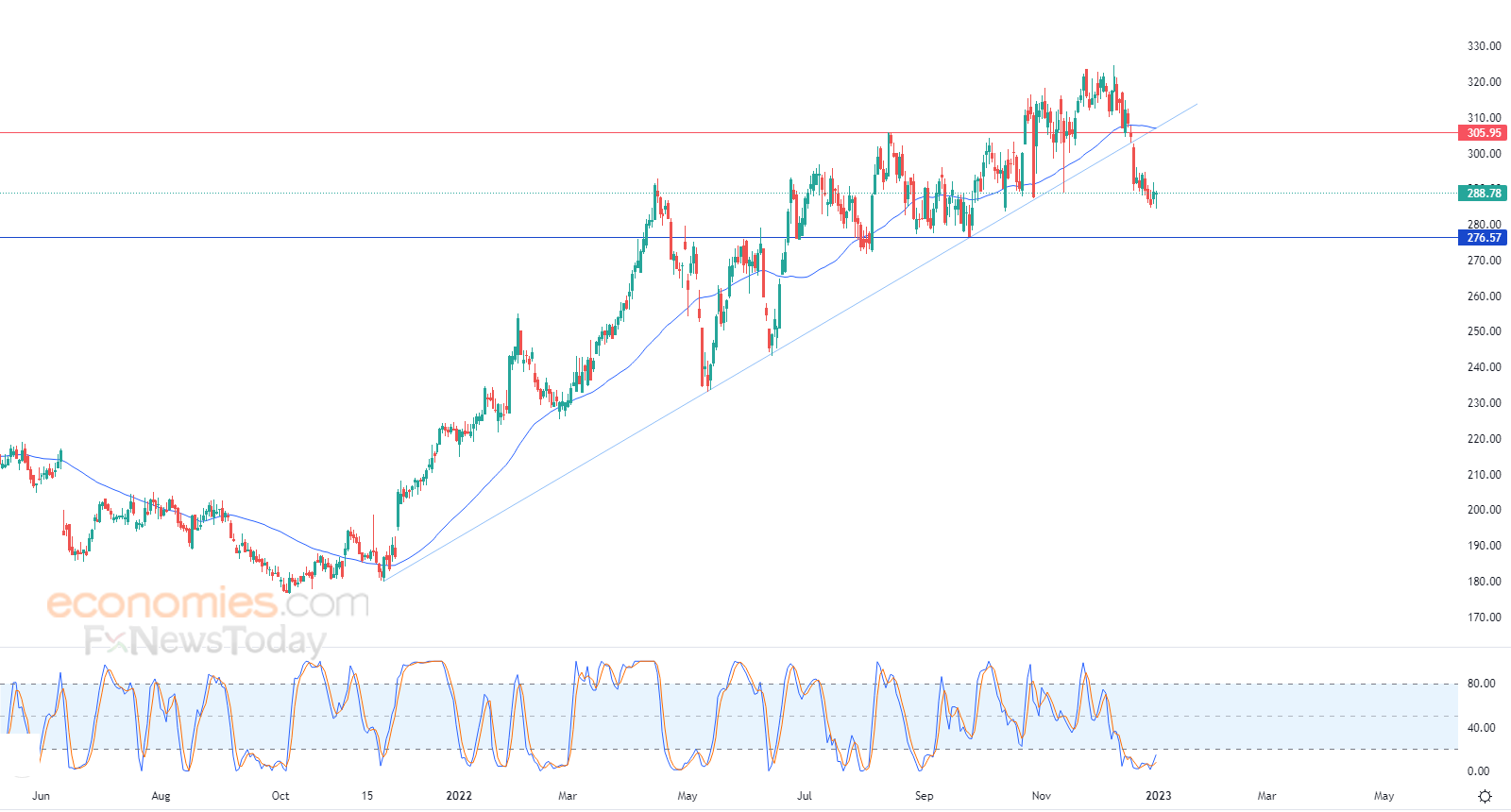 Therefore we expect more losses for the stock, targeting the first support at 276.57, provided the resistance of 306.00 holds on.