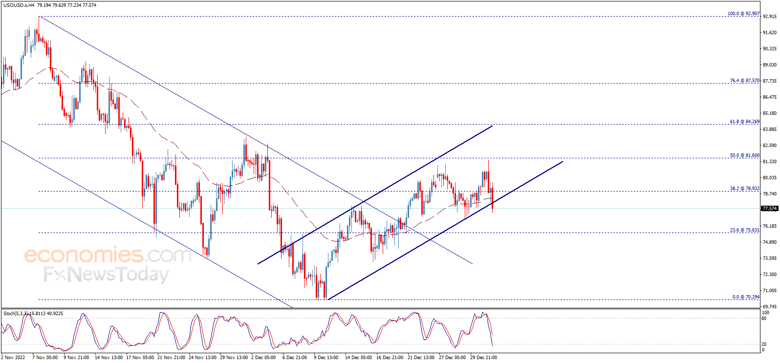 Crude oil price faced additional negative pressure to break 78.93 followed by the bullish channel’s support line and attempts to settle below this support, to increase the signals of turning to decline and stop the correctional bullish scenario, on its way to head towards 75.63 as a next main station, noting that the bearish bias will remain dominant unless the price managed to breach 78.93 and hold above it.