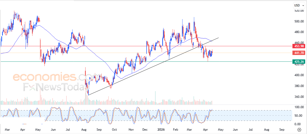 Therefore, we expect the stock price to decline during its upcoming trading sessions, as long as resistance at 454.00 remains intact, targeting the support level at 425.00.