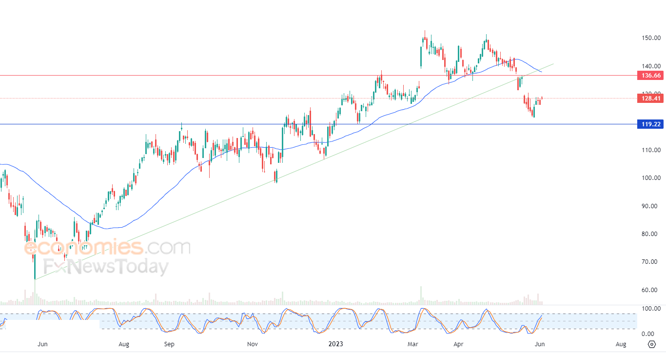 Therefore we expect the stock to return lower, targeting the support of 119.22, provided the resistance of 136.66 holds on.